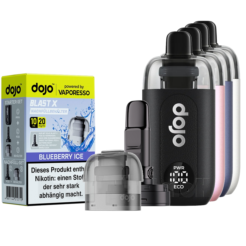 Vaporesso bietet hier ein neuartiges Podsystem. Das Dojo Blast X Starterset besteht aus dem 1000 mAh Akku, dem dazugehörigen Leerpod und einem Nachfüllbehälter ---> welcher mit 10 ml Liquid (siehe Auswahl) mit 20 mg Nikotinsalz, gefüllt ist.